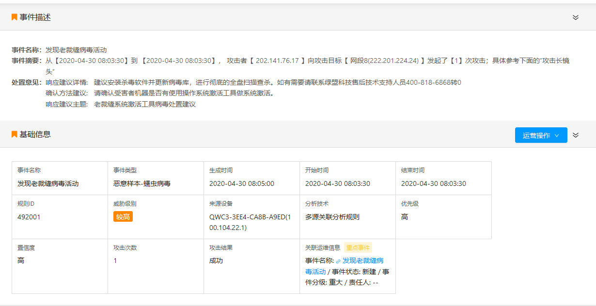 ¾ÅÓÎÀϸçÖÇÄÜÇå¾²ÔËӪƽ̨½«ÍâµØ¸æ¾¯Êý¾Ý¡¢ÍøÂç×ʲúÊý¾Ý¡¢Îó²îÊý¾ÝÓë¾ÅÓÎÀϸçÍþвÇ鱨Êý¾Ýƾ֤¶à¸öά¶È¾ÙÐйØÁªÆÊÎö£¬ÊµÊ±¸ÐÖª×ʲúµÄÍþвºÍųÈõÐÔ£¬Í¨¹ýƽ̨Çå¾²¹æÔòµÄɸѡºÍ¹ýÂË×îÖÕÐγÉ©¶·Ð§Ó¦£¬°ü¹Ü¸æ¾¯µÄÔ½·¢¾«×¼ºÍÓÐÓ㬲¢¶´²ìеÄÍþв¶¯Ïò¡£
