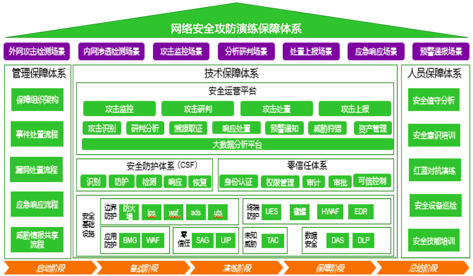 ÍøÂçÇå¾²¹¥·ÀÑÝÁ·°ü¹ÜϵͳÈçÉÏͼËùʾ¡£ÏÏû³ÁýÕÖ¹¥·ÀÑÝϰµÄÎå´ó½×¶Î¡£¹ØÓÚÿ¸ö½×¶Î¶¼Òª½¨ÉèÈýλһÌåµÄ°ü¹Üϵͳ£¬°üÀ¨ÖÎÀí°ü¹Ü¡¢ÊÖÒÕ°ü¹ÜºÍÖ°Ô±°ü¹Ü¡£ÖÎÀí°ü¹ÜÊÇͨ¹ýÊáÀí×éÖ¯¼Ü¹¹ºÍÖÖÖÖ°ü¹ÜÁ÷³Ì£¬´ÓÖÎÀí²ãÃæÂòͨ¸÷¸ö»·½Ú¡£ÊÖÒÕ°ü¹ÜÊÇ»ùÓÚÇå¾²»ù´¡ÉèÊ©¹¹½¨×ÝÉî·ÀÓùºÍÁãÐÅÍлúÖÆ£¬²¢½ÓÈëÇå¾²ÔËӪƽ̨ʵÏÖÕûÌåÔËÓª¡£Ö°Ô±°ü¹ÜÊÇͨ¹ý¶ÔÑÝÁ·Ö°Ô±µÄ¸³ÄÜÅàѵ£¬Öª×ã¼à¿Ø¡¢ÑÐÅС¢´¦Öóͷ£¡¢Éϱ¨µÈ¸÷»·½ÚÖжÔÖ°Ô±µÄÄÜÁ¦ÒªÇó¡£