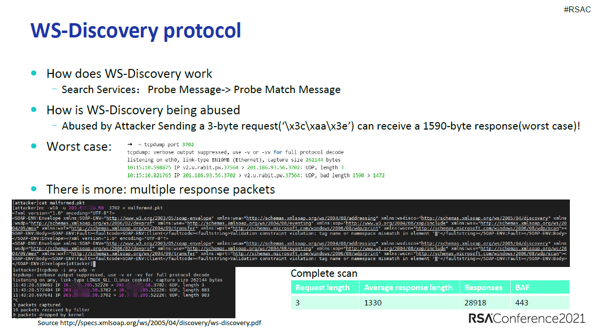 ÕâÀïʹÓÃÁËBAF(bandwidth amplification factor)´ø¿í·Å´óϵͳµÄ¿´·¨£¬×îÔçÔÚ2014ÄêNDSSµÄһƪÂÛÎÄ¡¶Amplification Hell: Revisiting Network Protocols for DDoS Abuse¡·ÖÐÌáµ½µÄ¡£ÎªÁËÅÌËãBAF£¬¿ÉÒÔ½«ÓÐÓøºÔØ·¢Ë͸øÊ¹ÓÃÕæÊµÔ´µØµã¹ûÕæµÄËùÓзþÎñ£¬ÑéÖ¤»ñµÃµÄÏìӦЧ¹ûÊý¾Ý¡£¾­ÓɲâÊÔ£¬·¢Ë͵ÄÇëÇóµÄ³¤¶È3×Ö½Úʱ£¬ÊÕµ½µÄÏìÓ¦µÄƽ¾ù³¤¶ÈÊÇ1330£¬ÅÌËã³öBAFÊýÖµÊÇ443¡£Ê¹ÓøÃЭÒéÎó²î£¬Í¨¹ýWS-Discovery¿ÉÒÔ±¬·¢±ÈÇëÇóÁ÷Á¿´ó400¶à±¶ÒÔÉϵĶñÒâÁ÷Á¿¡£